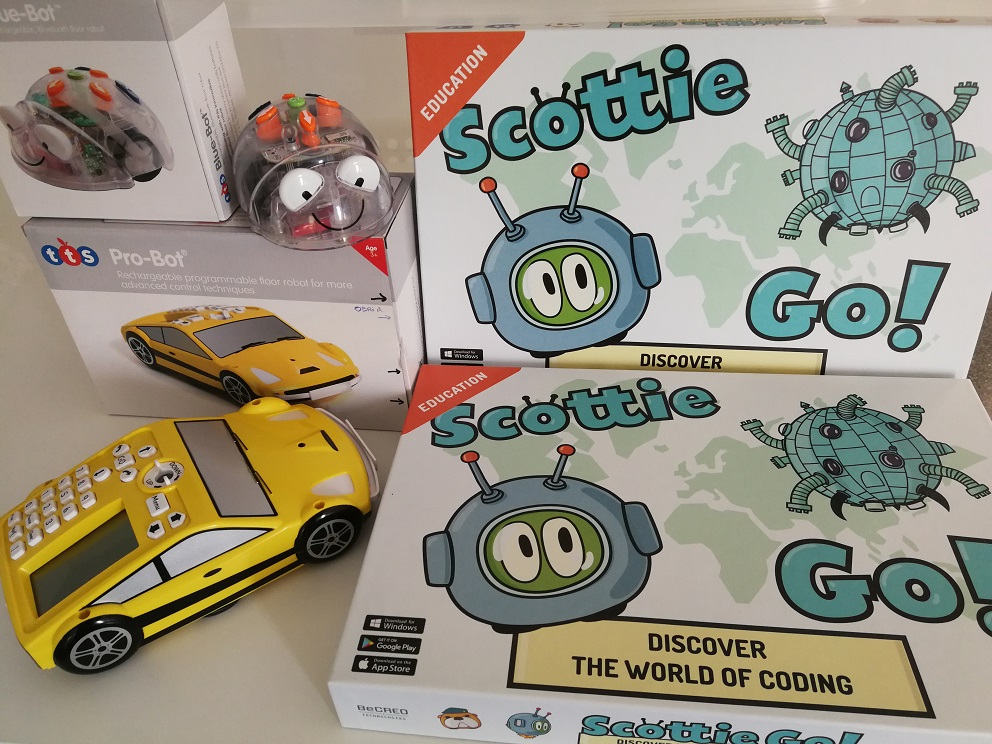 Maleta Robòtica: BlueBot, ProBot i Scottie GO! Reservar Caixa que conté dos PROBOT, dos BLUEBOT i dos jocs SCOTTIE GO! Amb aquesta caixa hi van quatre tauletes digitals: dues tenen l’APP de BLUE BOT i les altres dues, l’APP de l’SCOTTIE GO! També hi ha una base per als PROBOTS i una per als BLUE BOT (en prepararció, nov'20)